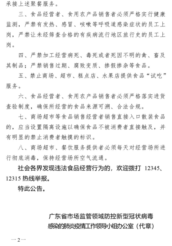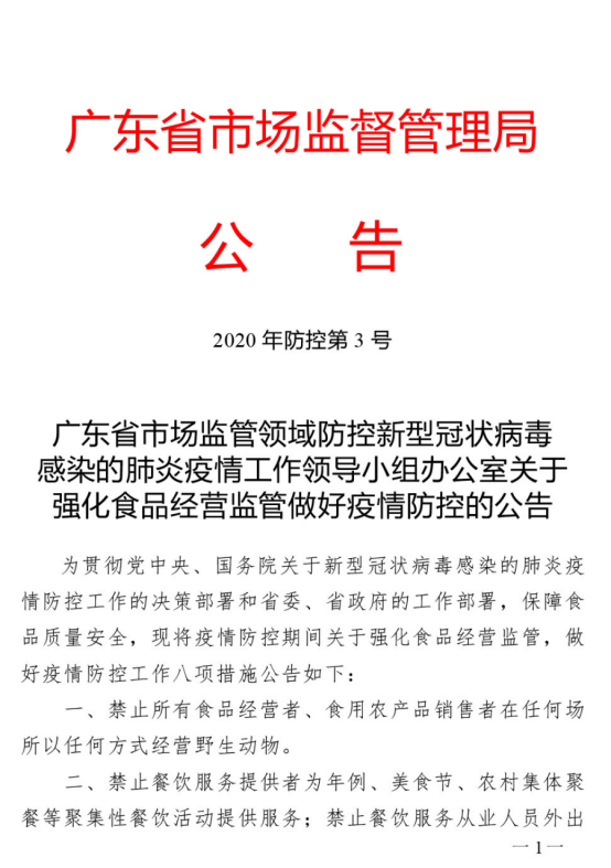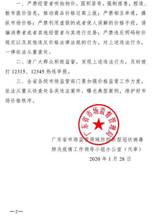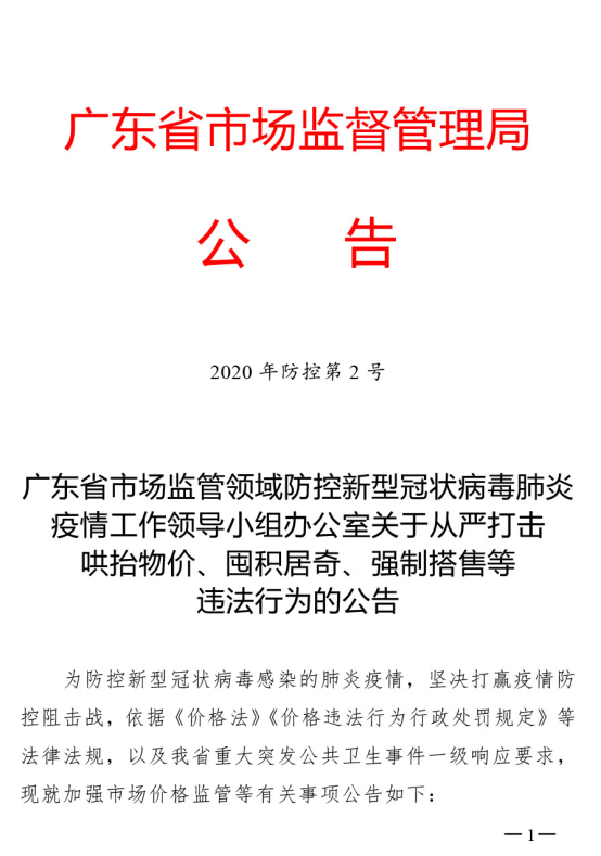 廣東省市場監(jiān)管領(lǐng)域防控新型冠狀病毒肺炎疫情工作領(lǐng)導小組辦公室關(guān)于從嚴打擊哄抬物價、囤積居奇、強制搭售等違法行為的公告